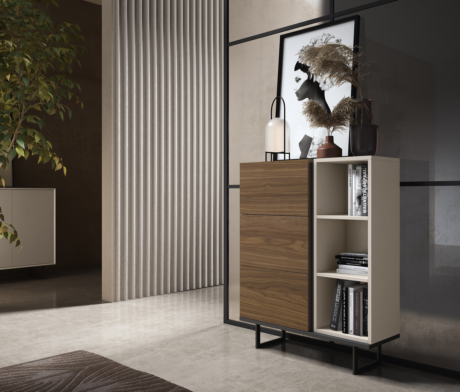En la parte superior, un módulo diáfano lacado en Visón ofrece tres huecos abiertos que permiten colocar elementos decorativos, libros o cestas de almacenaje. Este detalle aporta dinamismo al conjunto y permite personalizarlo fácilmente según el estilo de cada hogar.