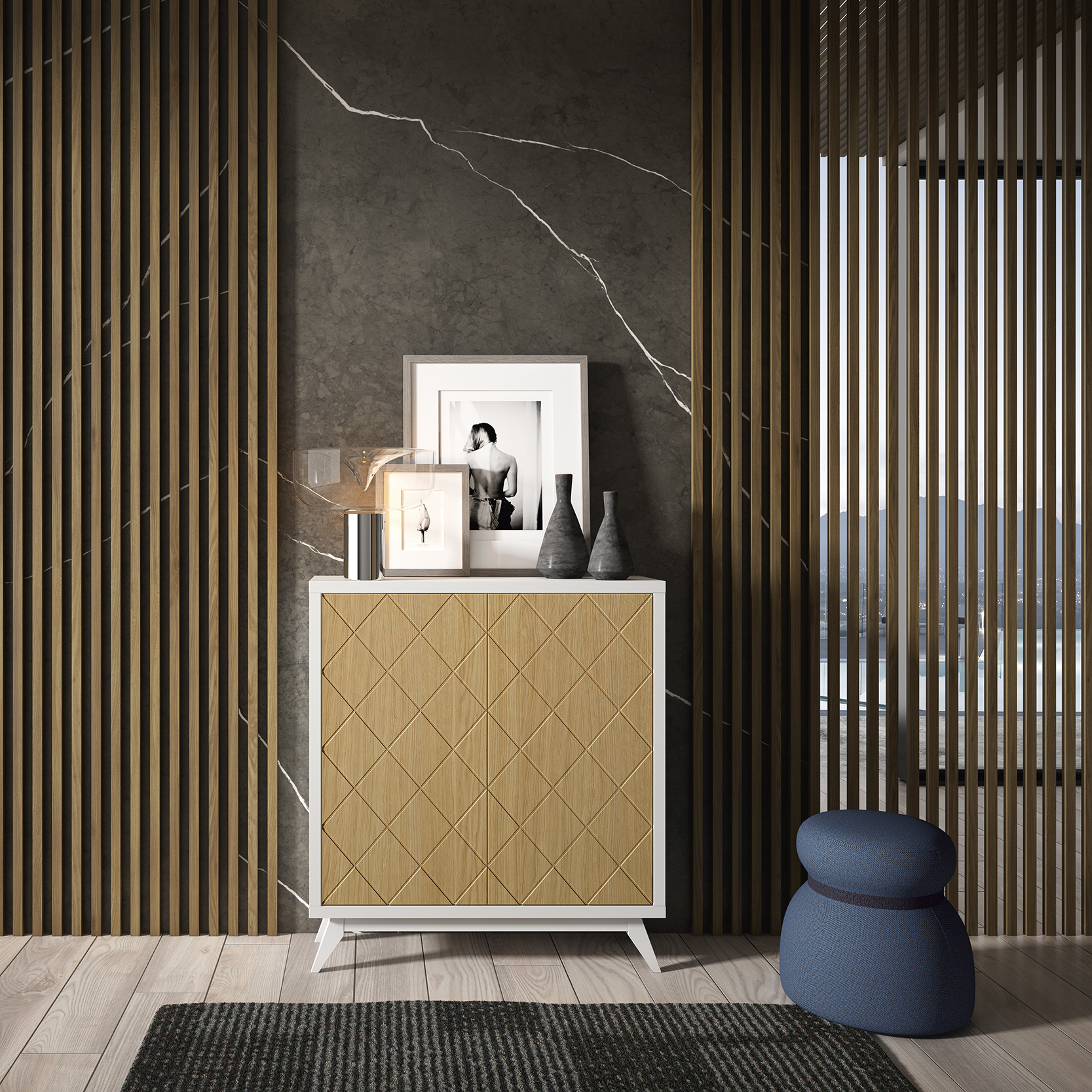 Este modelo destaca por su frente en chapa natural de roble, calado en forma de rombos, que aporta un toque distinguido y actual. Además, el color blanco lacado contrasta con la madera natural, creando un equilibrio visual muy atractivo.