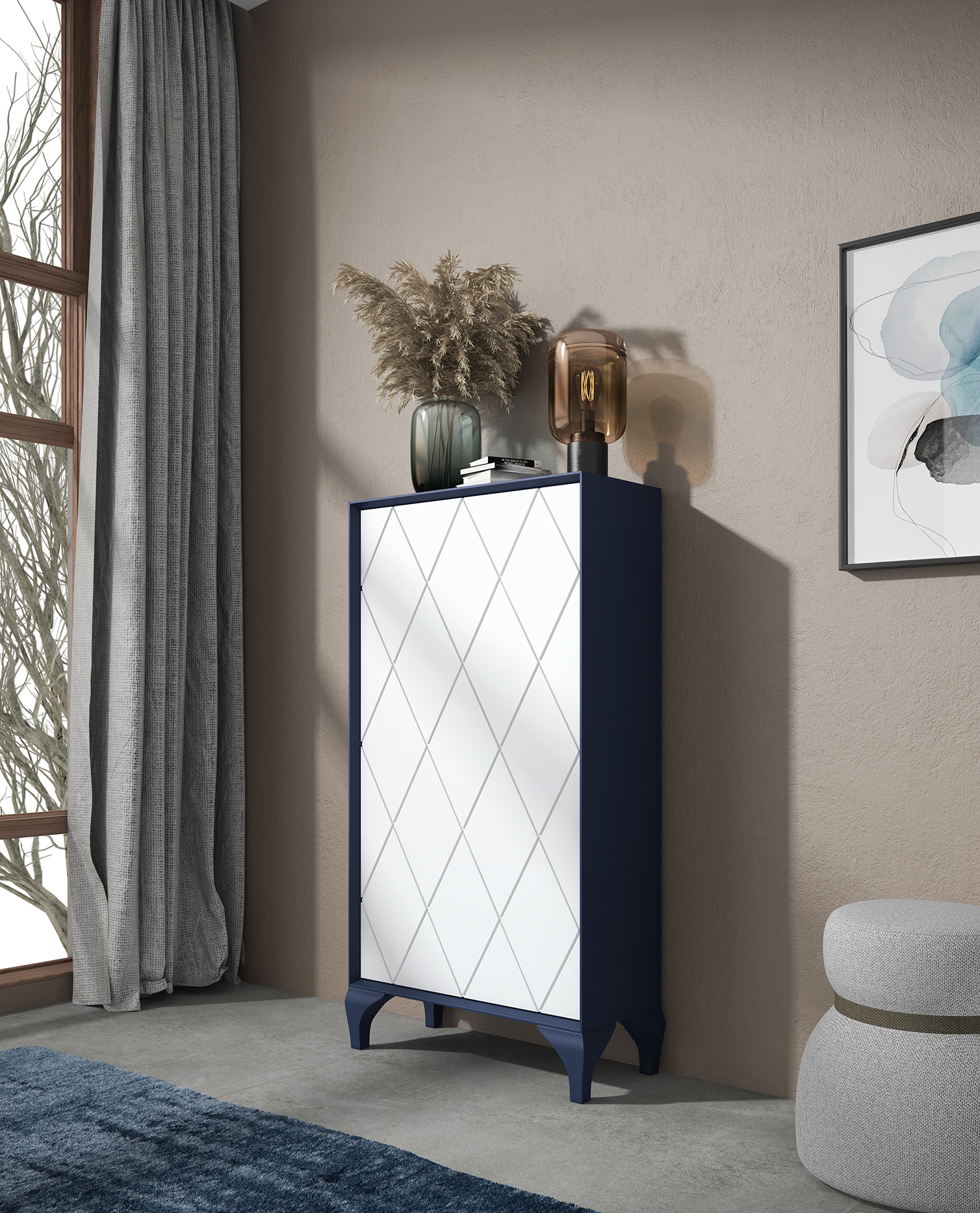 Su diseño destaca por el frente calado en forma de rombo, una característica que aporta dinamismo y personalidad al conjunto. Además, la combinación del lacado Azul Náutico con el frente blanco genera un contraste moderno y sofisticado, ideal para quienes buscan un mueble con carácter propio.