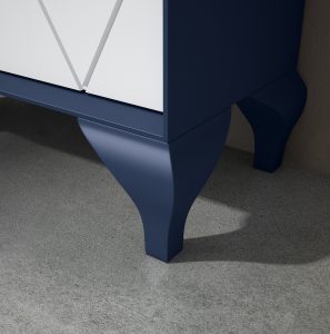 La estructura se apoya sobre un juego de patas CHIPPENDALE lacadas en Azul Náutico, de 13 cm de altura, que elevan visualmente el mueble y aportan ligereza al diseño. Este detalle, junto con su acabado brillante, contribuye a dar un aire desenfadado y elegante al mismo tiempo, encajando en estilos decorativos tanto clásicos como contemporáneos.