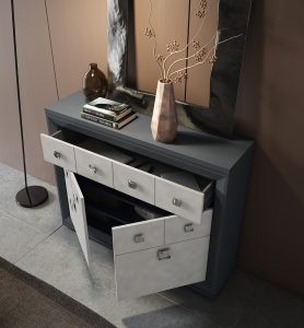 Gracias a la combinación del gris caliza, un tono metalizado luminoso, con el grafito profundo, el recibidor consigue un equilibrio perfecto entre sobriedad y sofisticación. Este contraste convierte al modelo BRAVE.BOC.48 en una pieza que encaja tanto en espacios modernos y urbanos como en ambientes más clásicos.