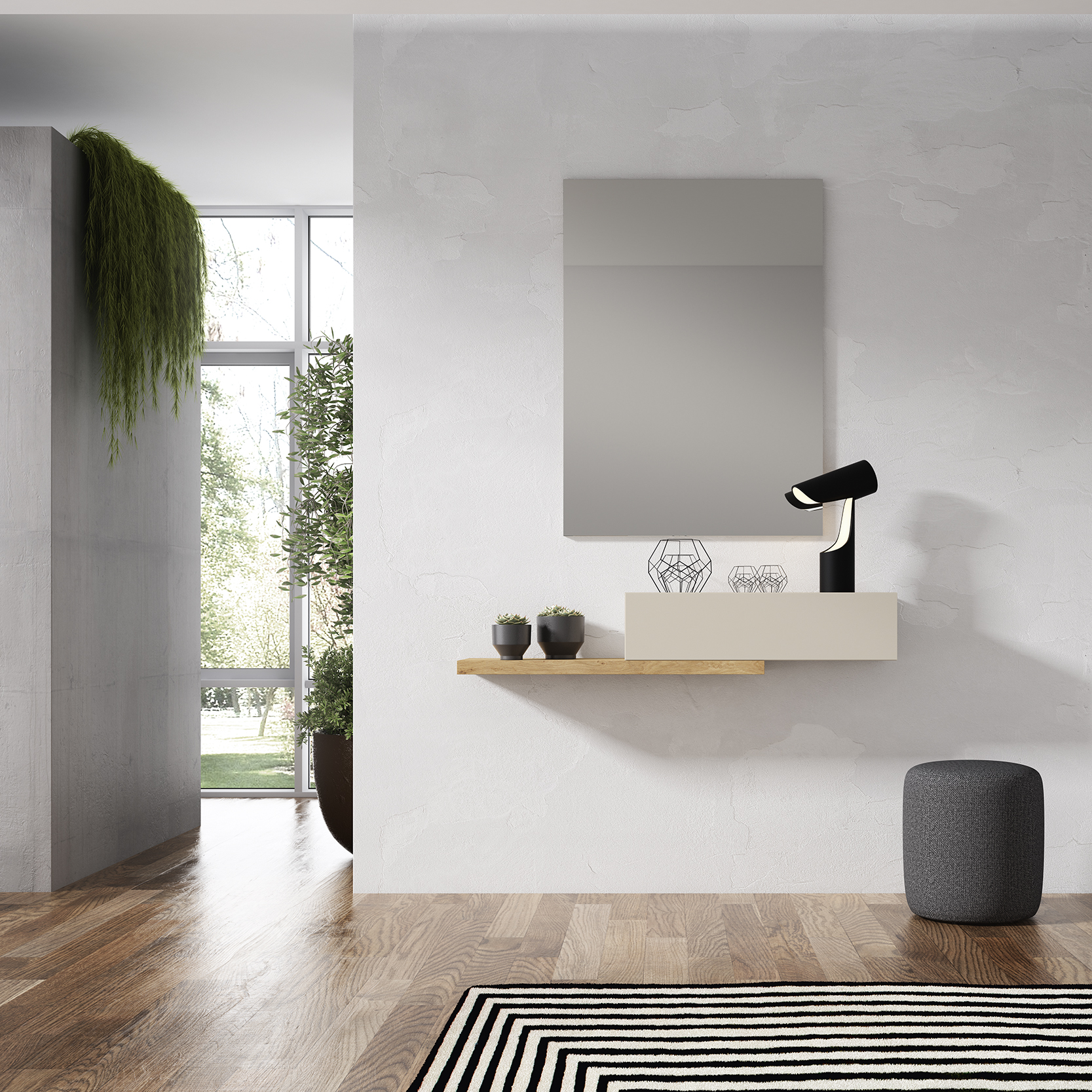El recibidor BRAVE.BOC.57 combina sencillez y elegancia en un diseño pensado para el día a día. Todos necesitamos un lugar donde dejar las llaves, el bolso o el móvil al llegar a casa, y este modelo lo ofrece con estilo. Su composición ligera, con cajón volado y encimera saliente, proporciona una solución práctica sin renunciar al diseño contemporáneo.