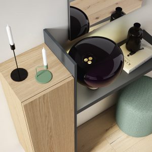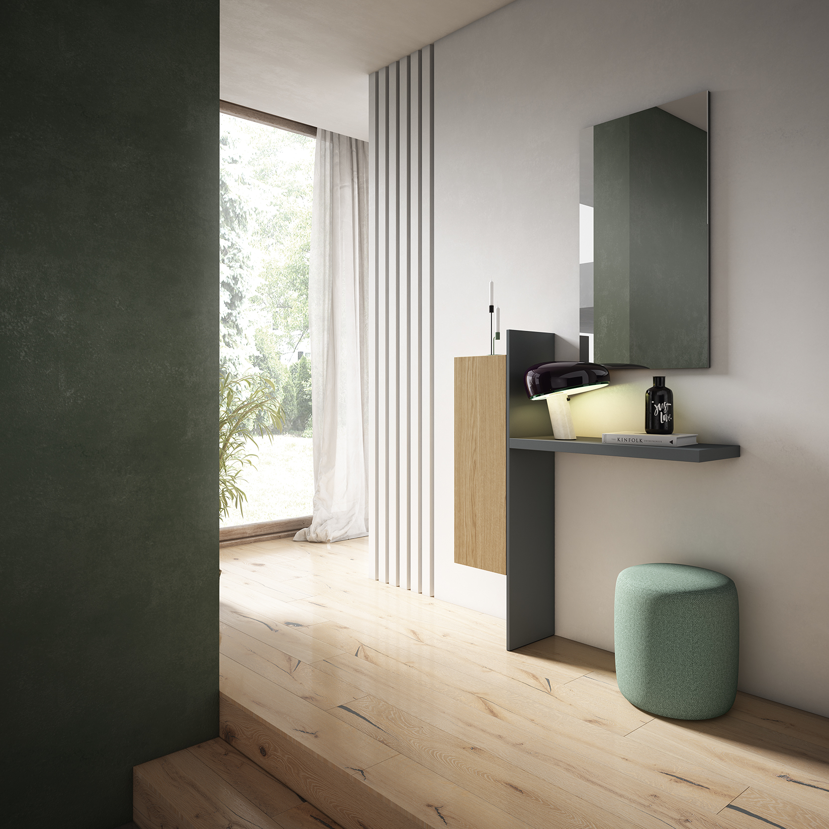 Gracias a la combinación del Roble Natural con el Grafito lacado, este mueble logra una apariencia cálida y contemporánea. Además, los distintos niveles y formas generan dinamismo visual, al mismo tiempo que aportan funcionalidad. Cada pieza está diseñada para ofrecer orden y ligereza, lo que lo convierte en una excelente opción para entradas pequeñas o medianas.