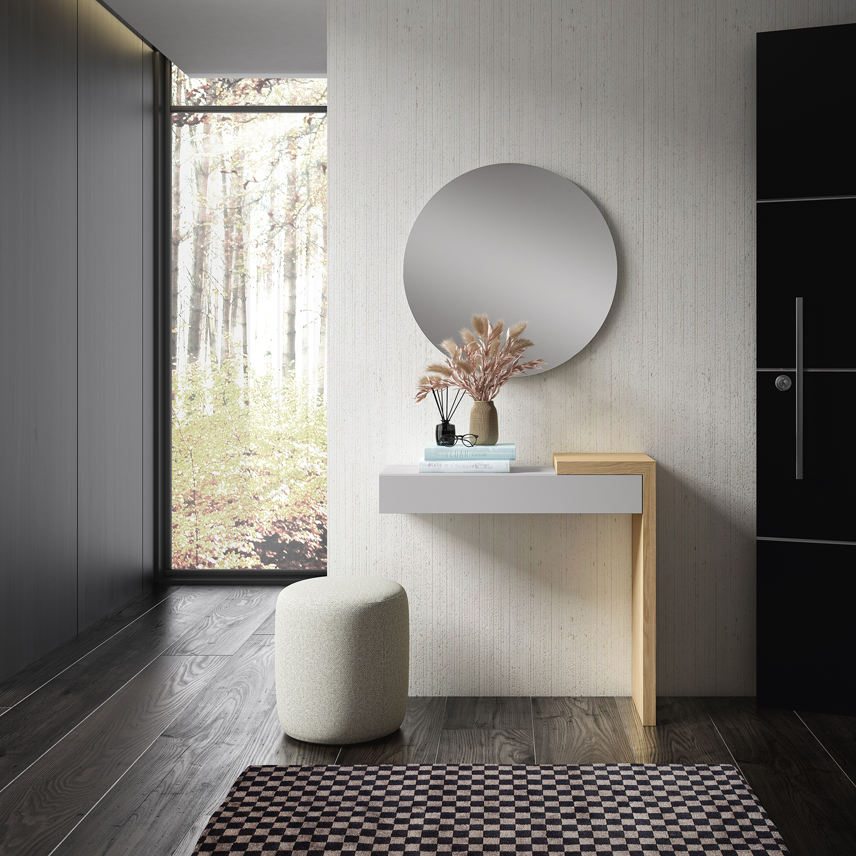 El conjunto incluye un marco con espejo redondo JOEL, lacado en Gris Natural, que amplía visualmente el espacio. Se completa con un costado BACK en forma de L de Roble Natural y un módulo de cajón con uñero oculto también en Gris Natural. Esta combinación de tonos neutros crea un equilibrio perfecto entre calidez y modernidad.