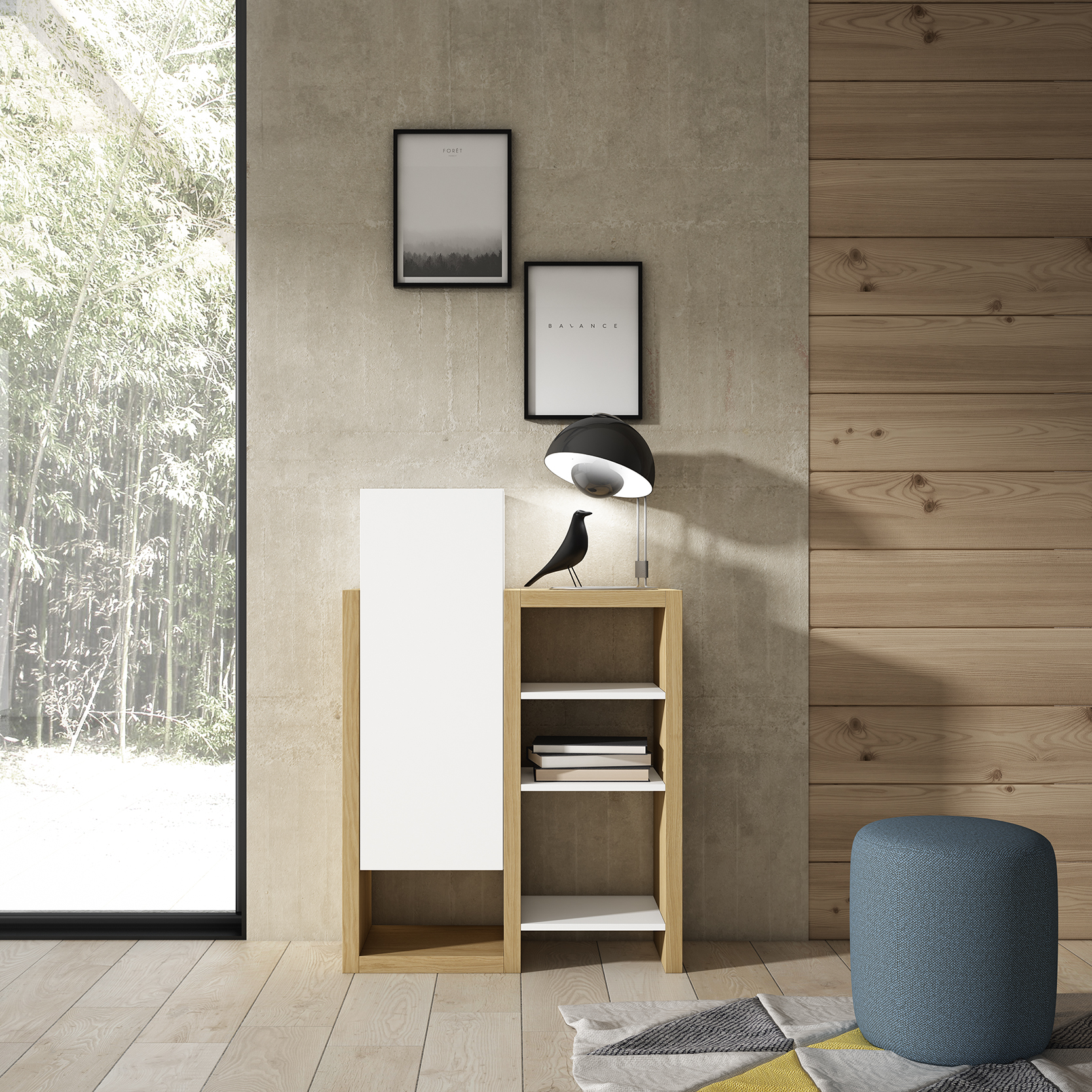 El módulo vertical con puerta batiente y apertura mediante uñero resulta práctico y visualmente limpio. Su disposición asimétrica y sus líneas rectas se adaptan a distintos estilos decorativos, desde el nórdico hasta el minimalista. Además, su estructura robusta garantiza durabilidad y estabilidad, algo esencial en los muebles de entrada.