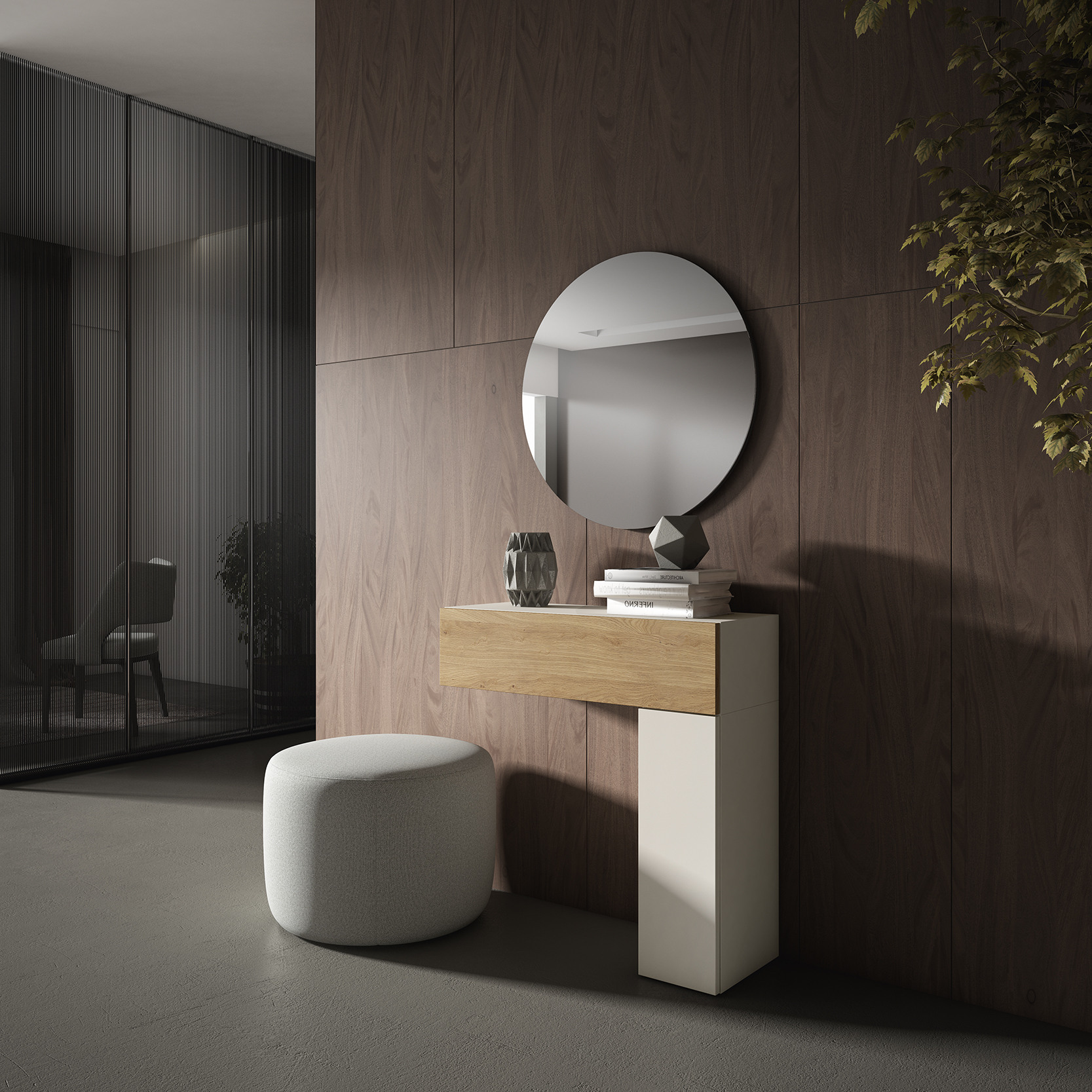 El recibidor BRAVE.BOC.72 destaca por su estética ligera y contemporánea. Su módulo de cajón horizontal volado genera una sensación de mueble suspendido, aportando amplitud visual y elegancia al espacio. El conjunto se completa con un costado ancho en forma de L invertida, que crea un hueco perfecto para colocar un puff decorativo o funcional, añadiendo un toque acogedor.