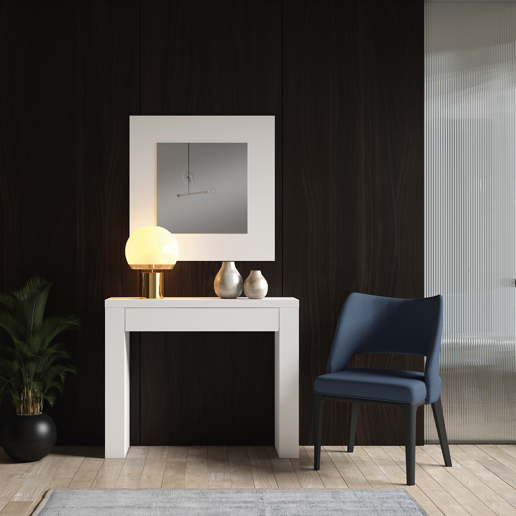 El conjunto se completa con un espejo de marco ancho, lacado en blanco, que aporta luminosidad y un toque neoclásico al espacio. Su forma cuadrada equilibra el conjunto, convirtiendo este recibidor en un punto focal de estilo y elegancia.