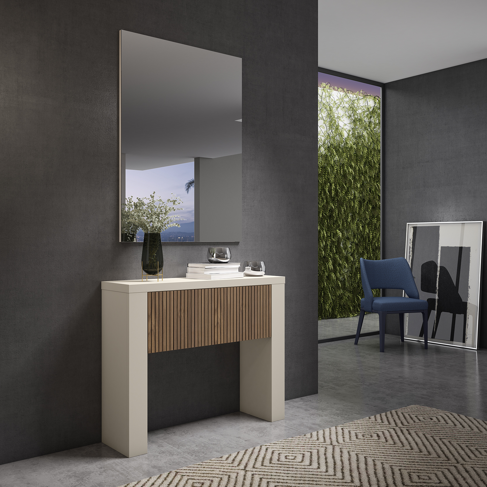 Este recibidor destaca por su diseño contemporáneo y por la calidad de sus materiales. Por un lado, el tablero boreal con efecto listonado aporta textura y profundidad, creando un estilo natural y sofisticado. Por otro lado, el acabado lacado en visón ofrece una sensación de elegancia y serenidad, ideal para ambientes modernos.