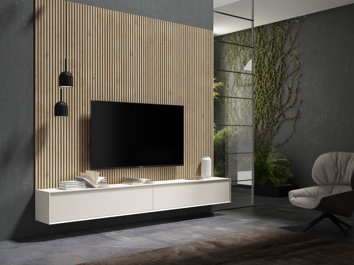 Este mueble destaca por su diseño contemporáneo y por el cuidado en cada detalle. Los módulos horizontales lacados en blanco aportan una sensación de pureza y luminosidad, mientras que los paneles verticales en roble Hera añaden la calidez natural de la madera. Gracias a esta combinación, el resultado es una composición armónica, ideal para espacios modernos y elegantes.