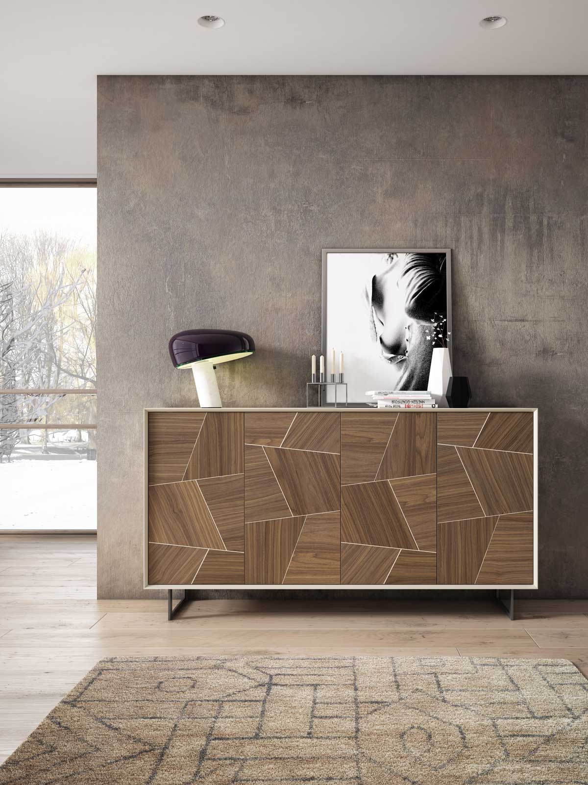 1 aparador NERO en laca Visón con cuatro puertas acabado marquetería Nogal Americano (174x77x40).