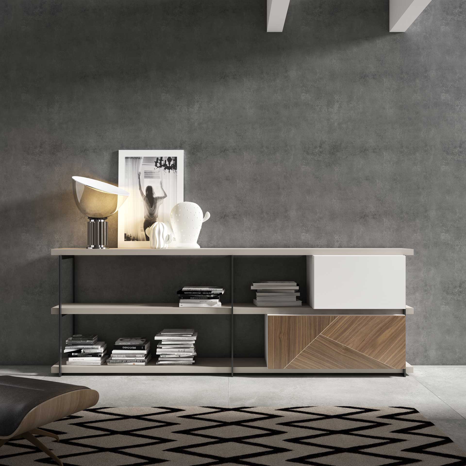 Gracias a su estructura con módulos horizontales y patas metálicas, esta pieza transmite ligereza visual sin renunciar a la solidez. Además, su frente en auténtica marquetería ofrece un toque artesanal y exclusivo que marca la diferencia.