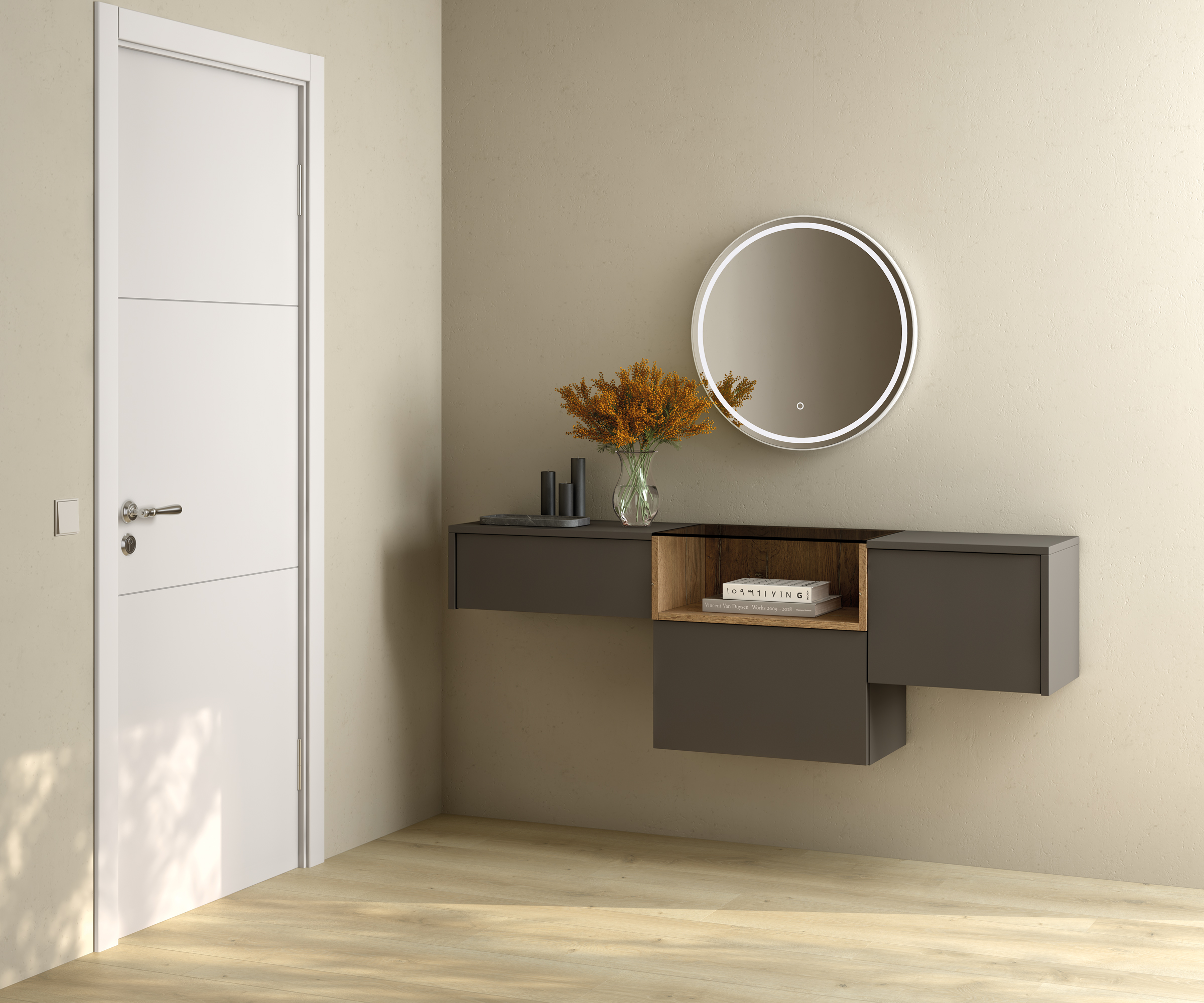 Recibidor colgado que da mas amplitud a tu entrada, con 2 puertas, 1 cajón y un hueco decorativo.