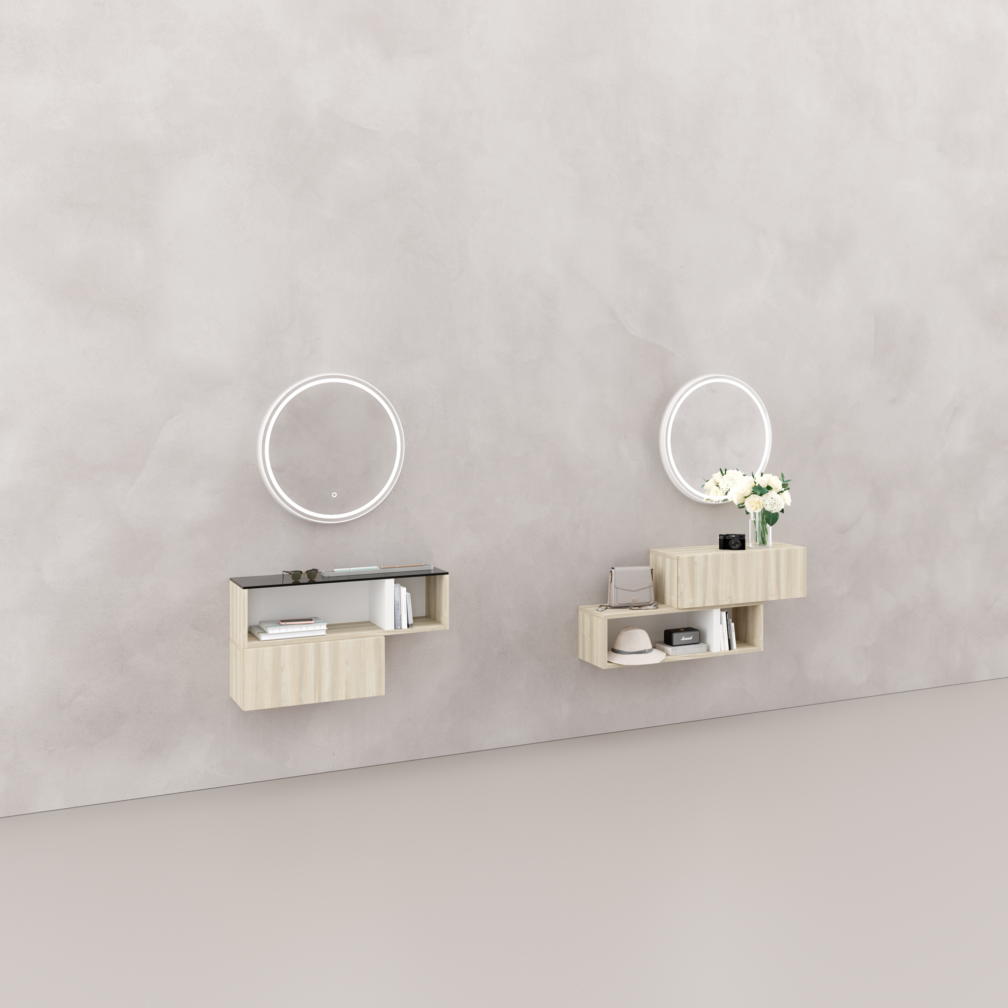 Recibidores con encanto de estilo escandinavo con espejo redondo retroiluminado.