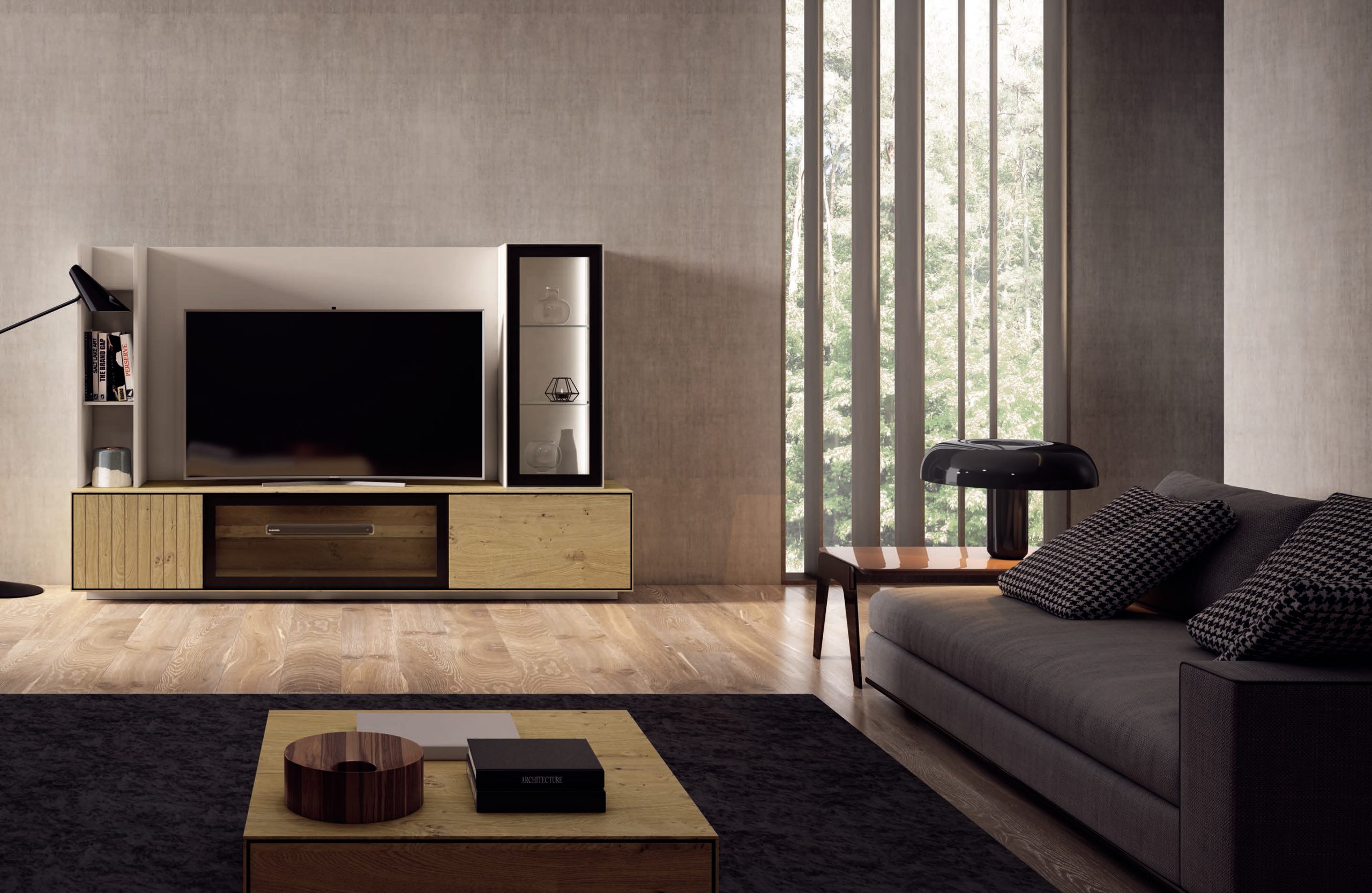 La composición incluye una vitrina, un librero y un módulo bajo con trampón y puerta. Además, incorpora otro mueble vitrina pensado para guardar aparatos electrónicos. Así, se pueden mantener fuera de la vista, pero seguir usándolos cómodamente con los mandos a distancia. Este detalle demuestra su funcionalidad y cuidado en el diseño.