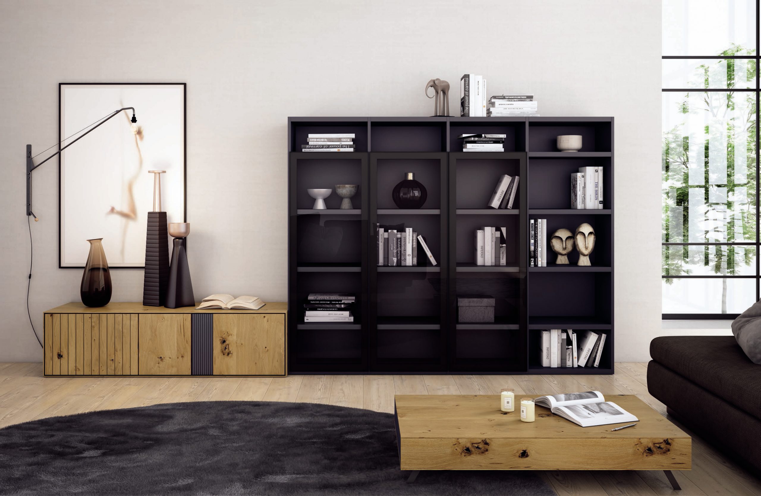 La librería Loft Neo 42 no solo destaca por su diseño, sino también por su capacidad. Sus módulos de gran tamaño ofrecen espacio suficiente para almacenar con estilo. Además, los acabados rayados y ranurados en las puertas inferiores aportan textura y dinamismo, haciendo que la pieza resulte más decorativa y moderna.