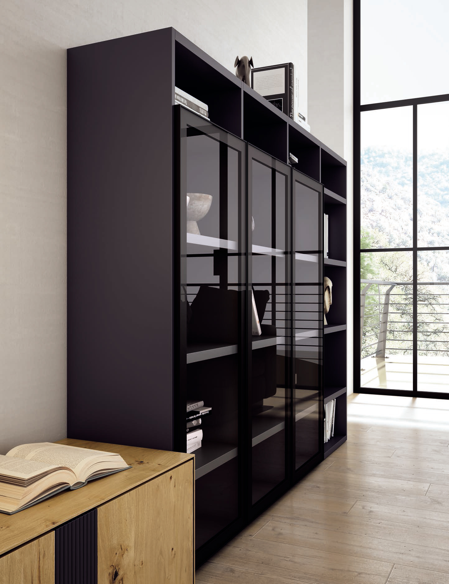 El salón Loft Neo 42 es una composición tipo librería con vitrinas que destaca por su estilo funcional y equilibrado. Está diseñada completamente en color sombra, lo que le aporta elegancia, sobriedad y un aspecto contemporáneo. Gracias a su estructura abierta, combina perfectamente el almacenaje de libros con la exposición de objetos decorativos.