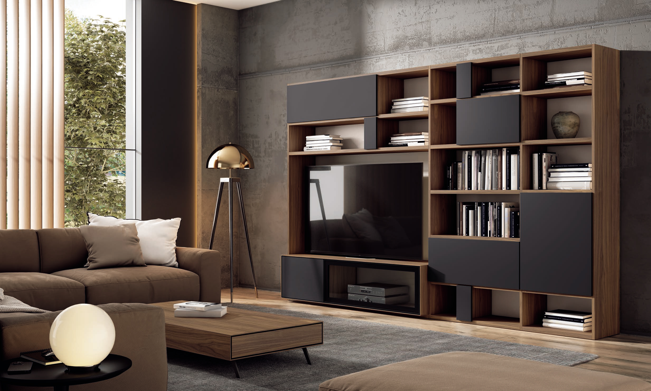 El salón Loft Neo 43 es una composición tipo librería que combina diseño moderno y calidez natural. Está fabricada en color sombra y nogal americano, con una trasera en lino que resalta el contraste de los materiales. Gracias a esta mezcla, el resultado es un mueble elegante, equilibrado y con una presencia muy distinguida.