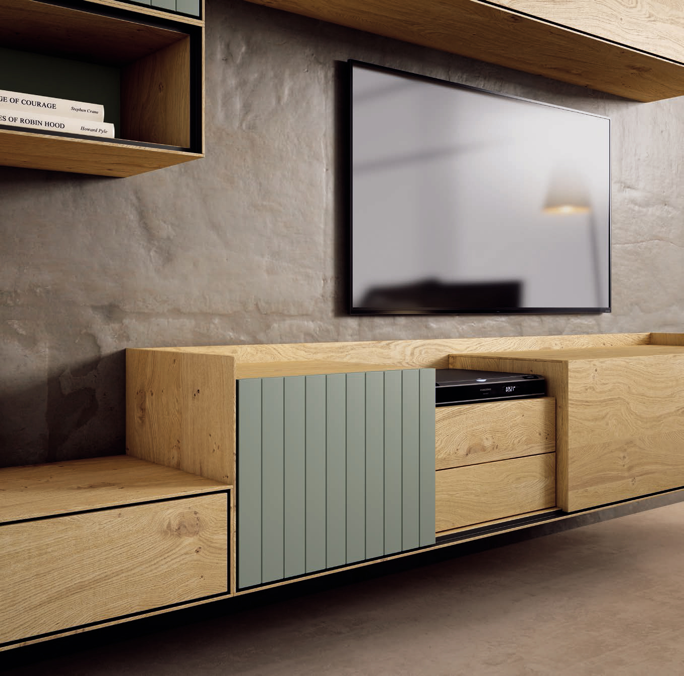 Los módulos colgados dan ligereza visual y ayudan a aprovechar el espacio. Además, los frentes rayados en verde añaden detalle y estilo, rompiendo la uniformidad de las superficies. Gracias a esta combinación de formas y acabados, la composición resulta visualmente equilibrada y elegante.