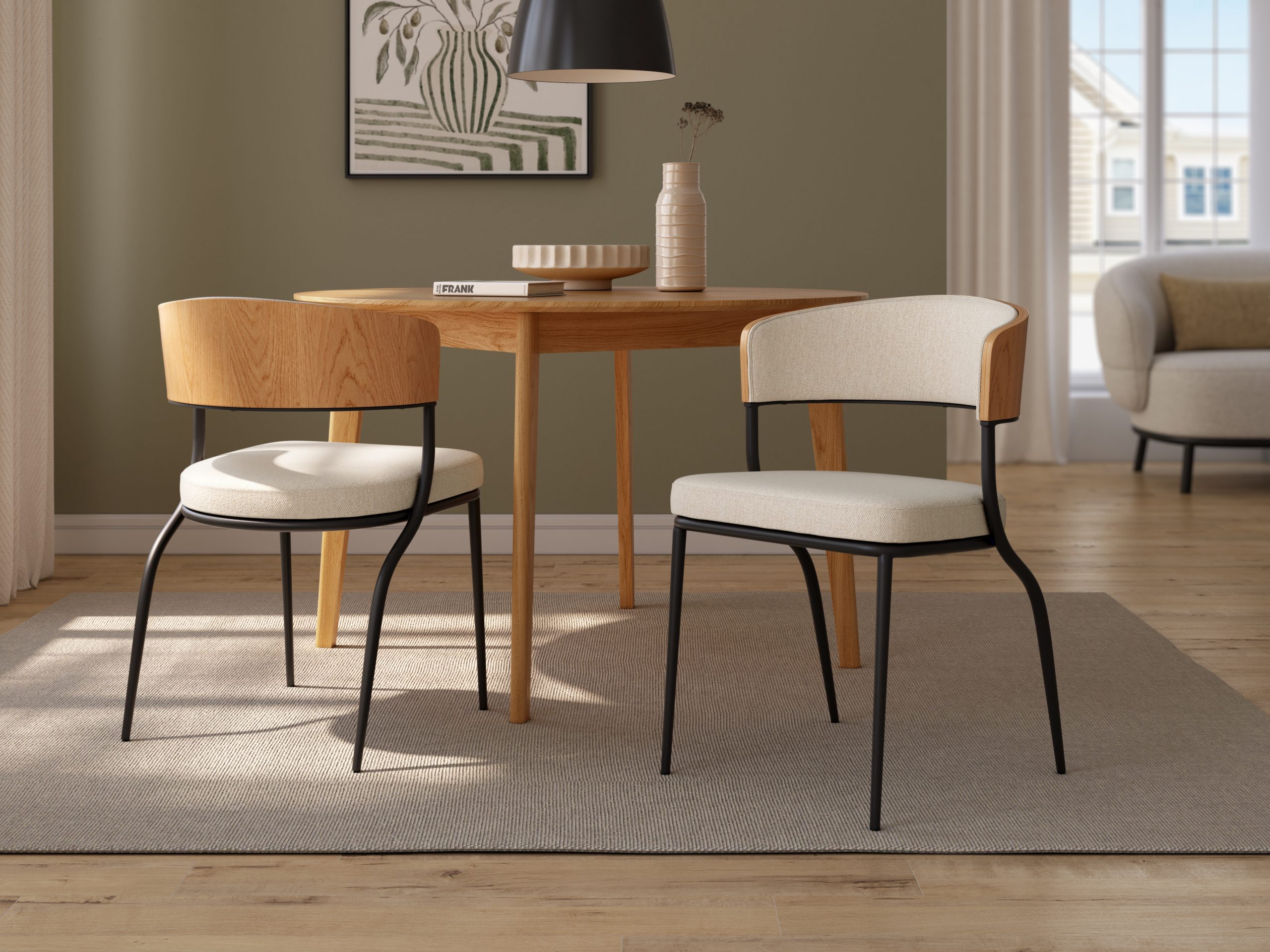 Silla con asiento tapizado y respaldo de madera y tapizado.