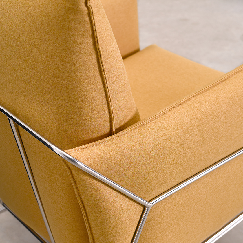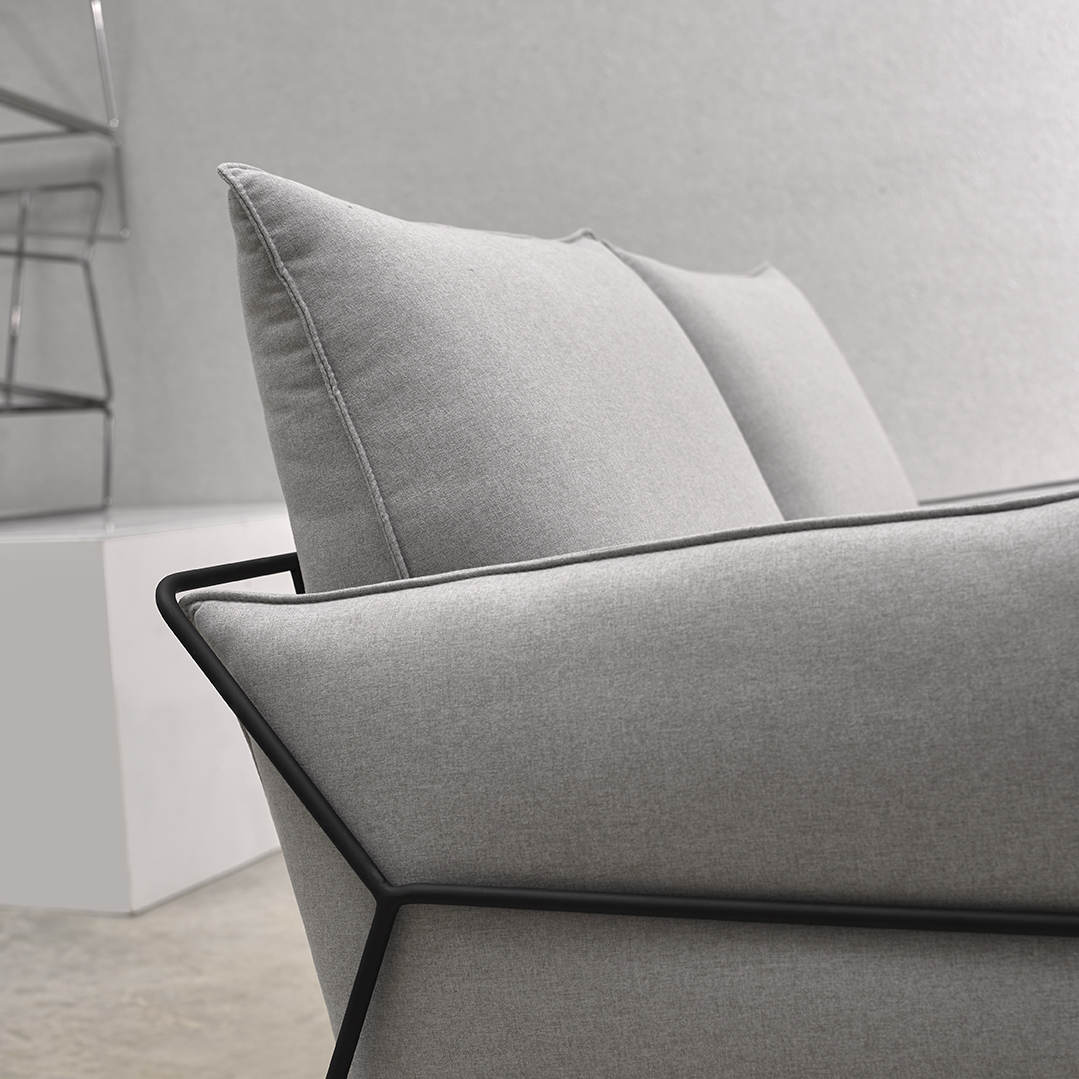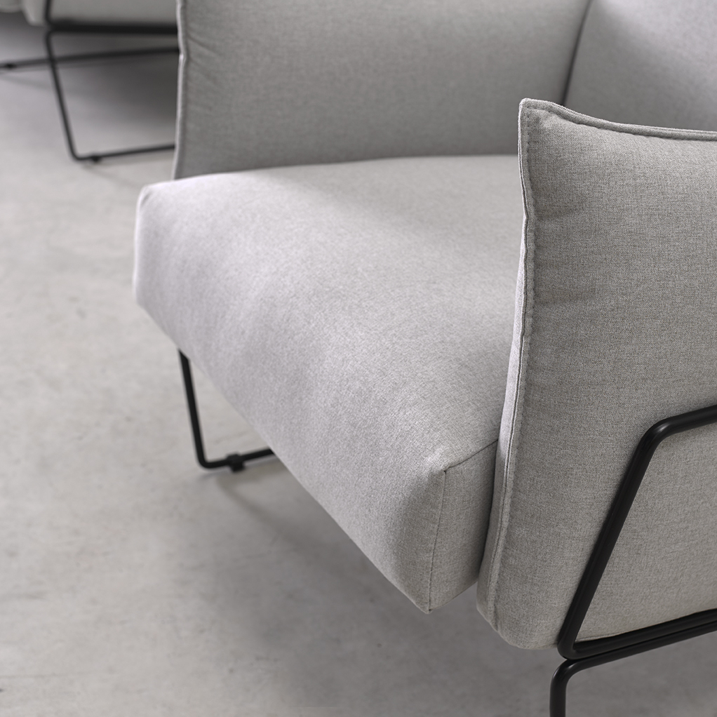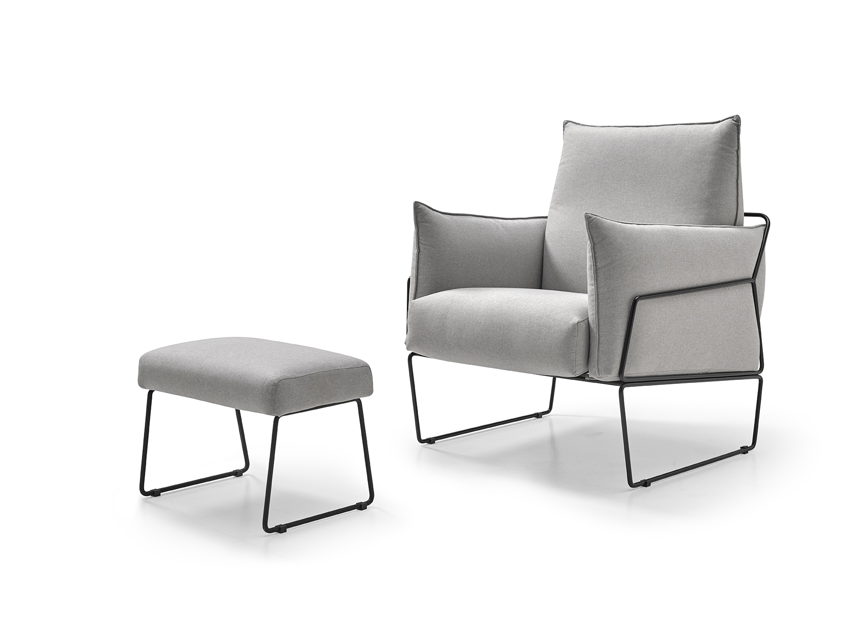 La butaca Gemma metal de líneas depuradas geométricas y cojines con pestaña francesa es una pieza totalmente funcional, ergonómica y atemporal. Completamente desenfundable. Con puf a juego opcional.