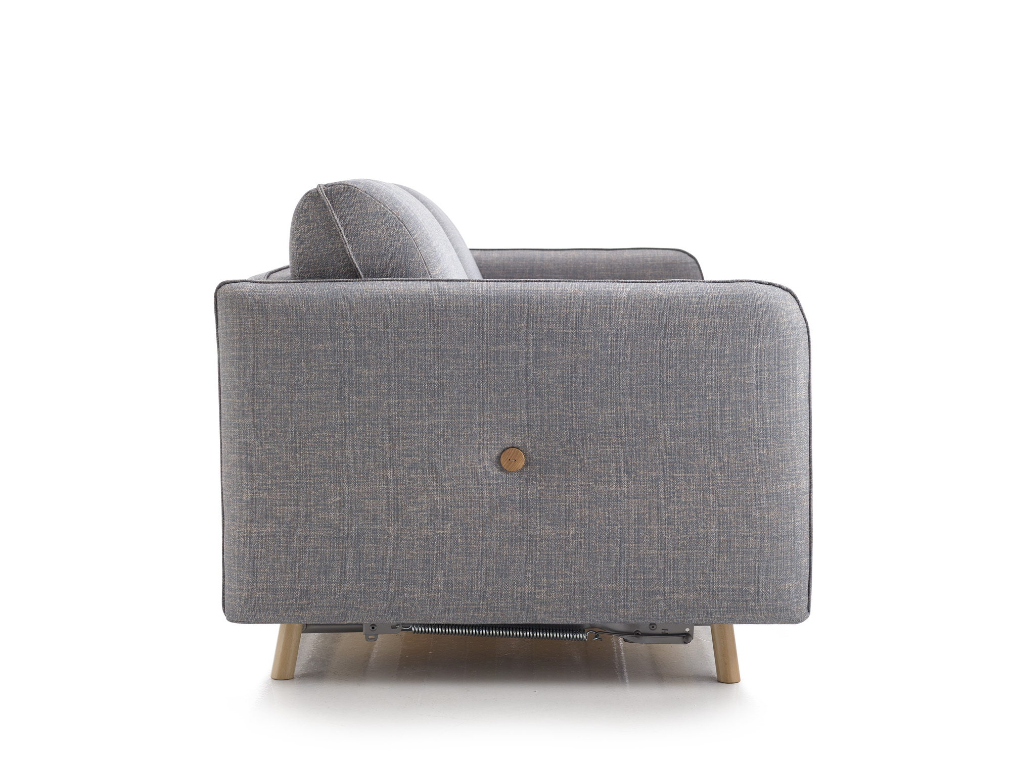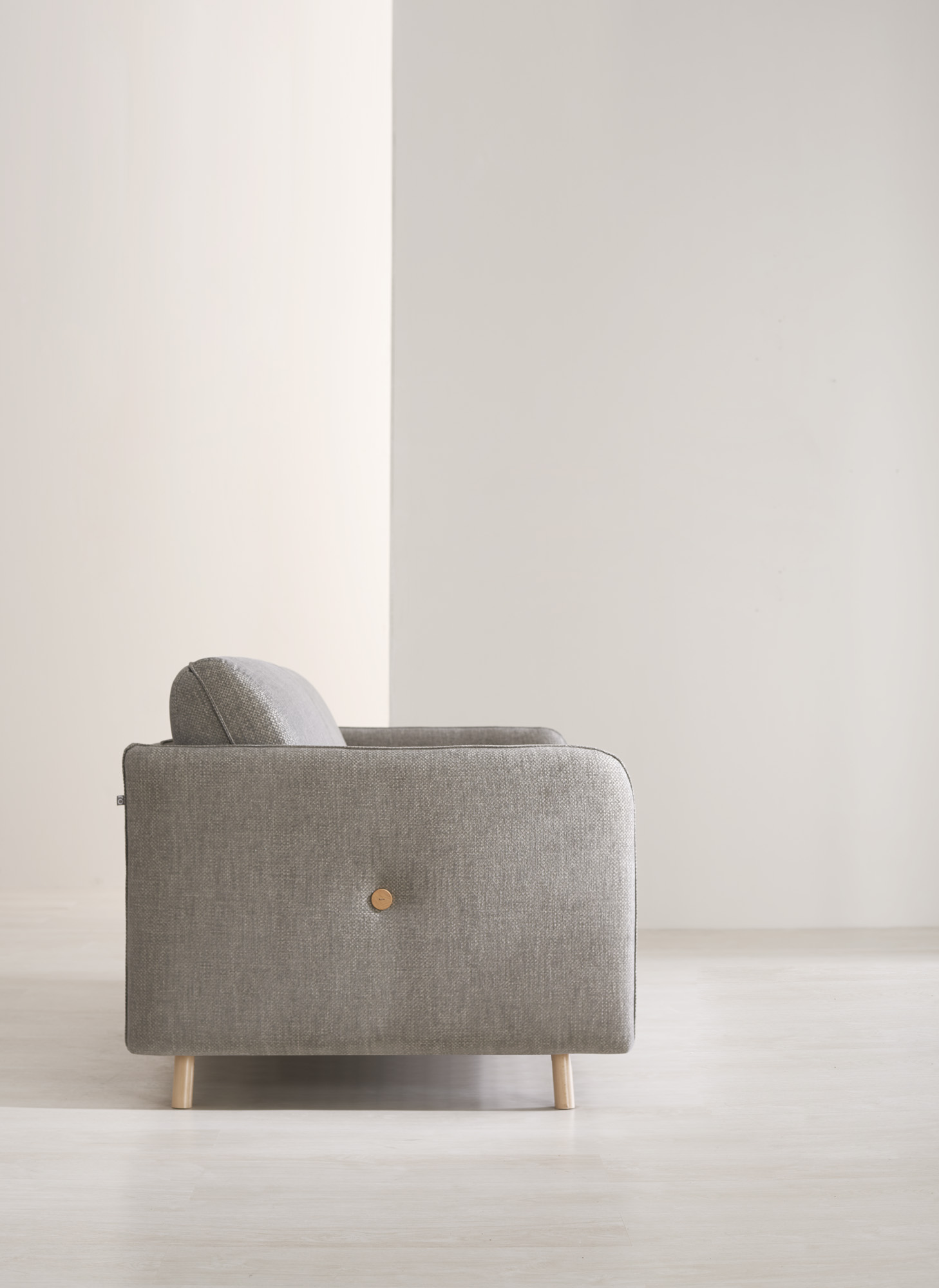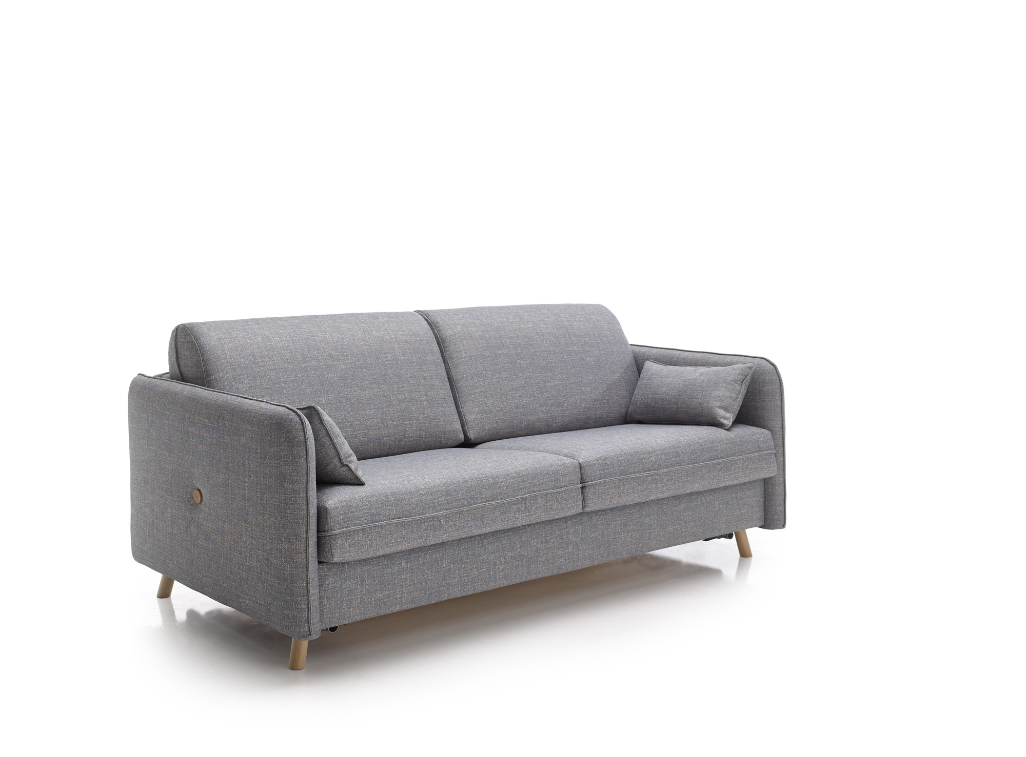 Este sofá cama BOTTON es práctico y de muy fácil apertura y cierre. Gracias a sus brazos estrechos es ideal para espacios reducidos. Con detalles de botones en sus brazos a juego de las patas de madera. Disponible en diferentes acabados de telas y colores. Hecho en España, con mecanismo europeo de gran calidad.