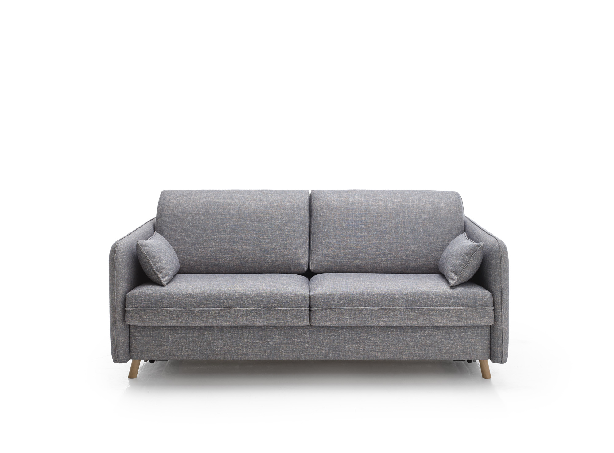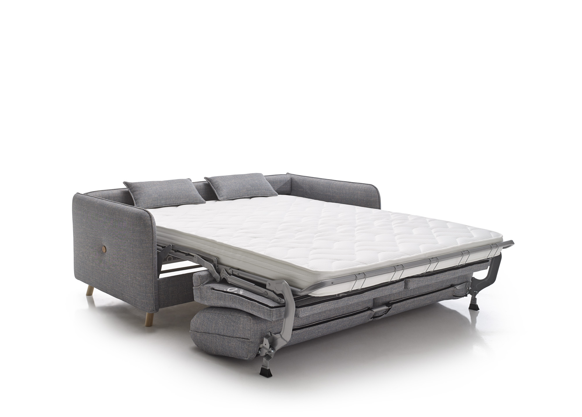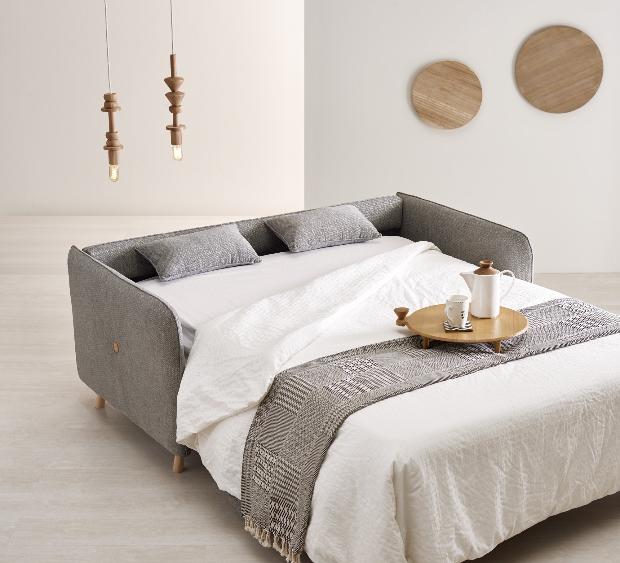 Este sofá cama BOTTON es práctico y de muy fácil apertura y cierre. Gracias a sus brazos estrechos es ideal para espacios reducidos. Con detalles de botones en sus brazos a juego de las patas de madera. Disponible en diferentes acabados de telas y colores. Hecho en España, con mecanismo europeo de gran calidad.