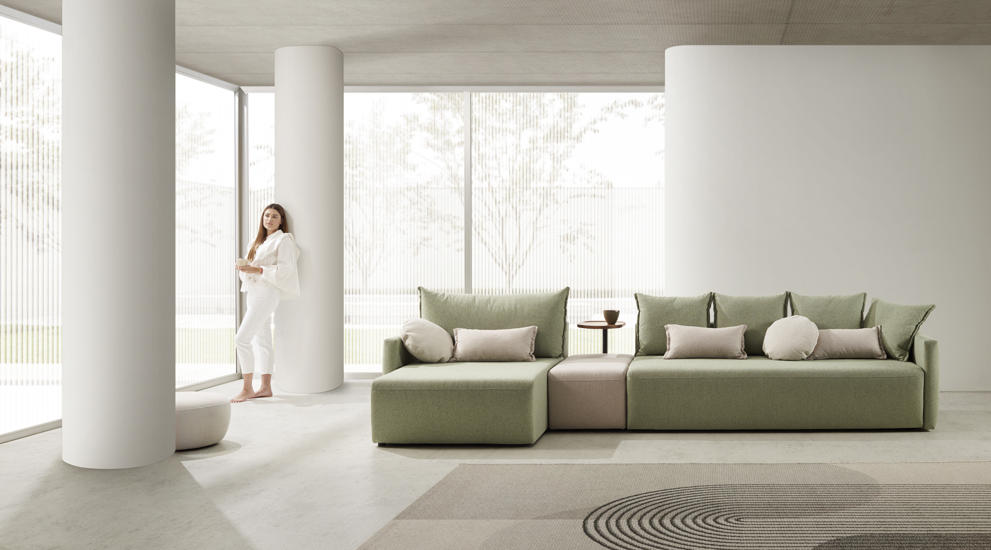 - Respaldo con cojines de serie: 4 cojines de 60×60 cm. y 2 cojines de 60×35 cm. Rellenos de fibra PLUS efecto plumón.