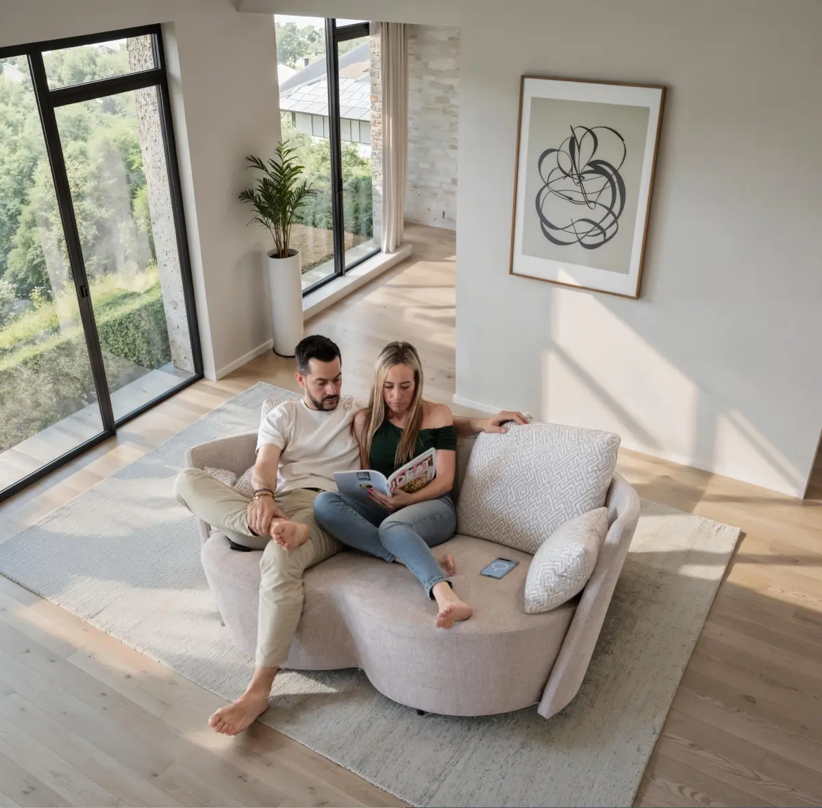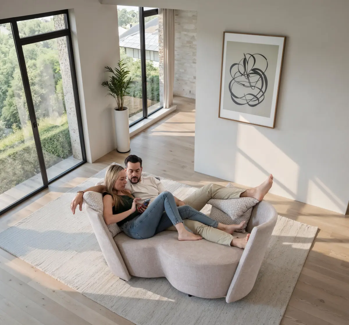 El sofá Infinity está pensado para hogares modernos donde se valora tanto la estética como la funcionalidad. Su sistema giratorio y su forma envolvente permiten crear distintos ambientes sin esfuerzo, pasando de una disposición íntima a una más abierta en cuestión de segundos.