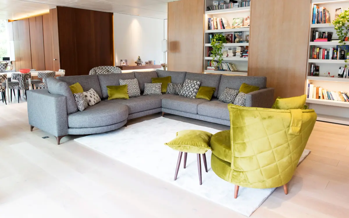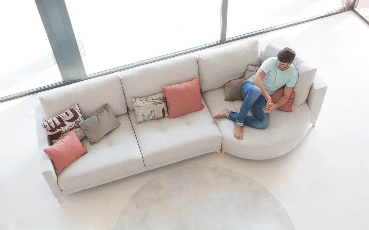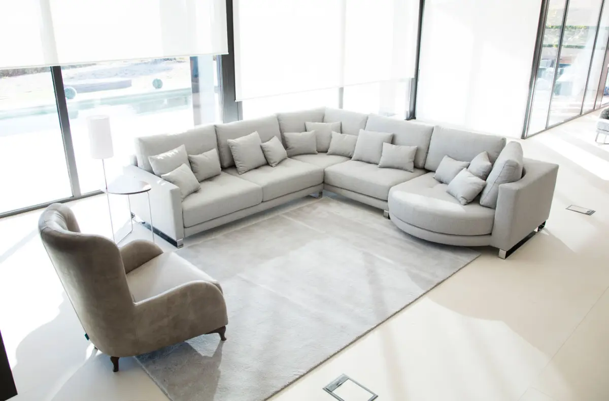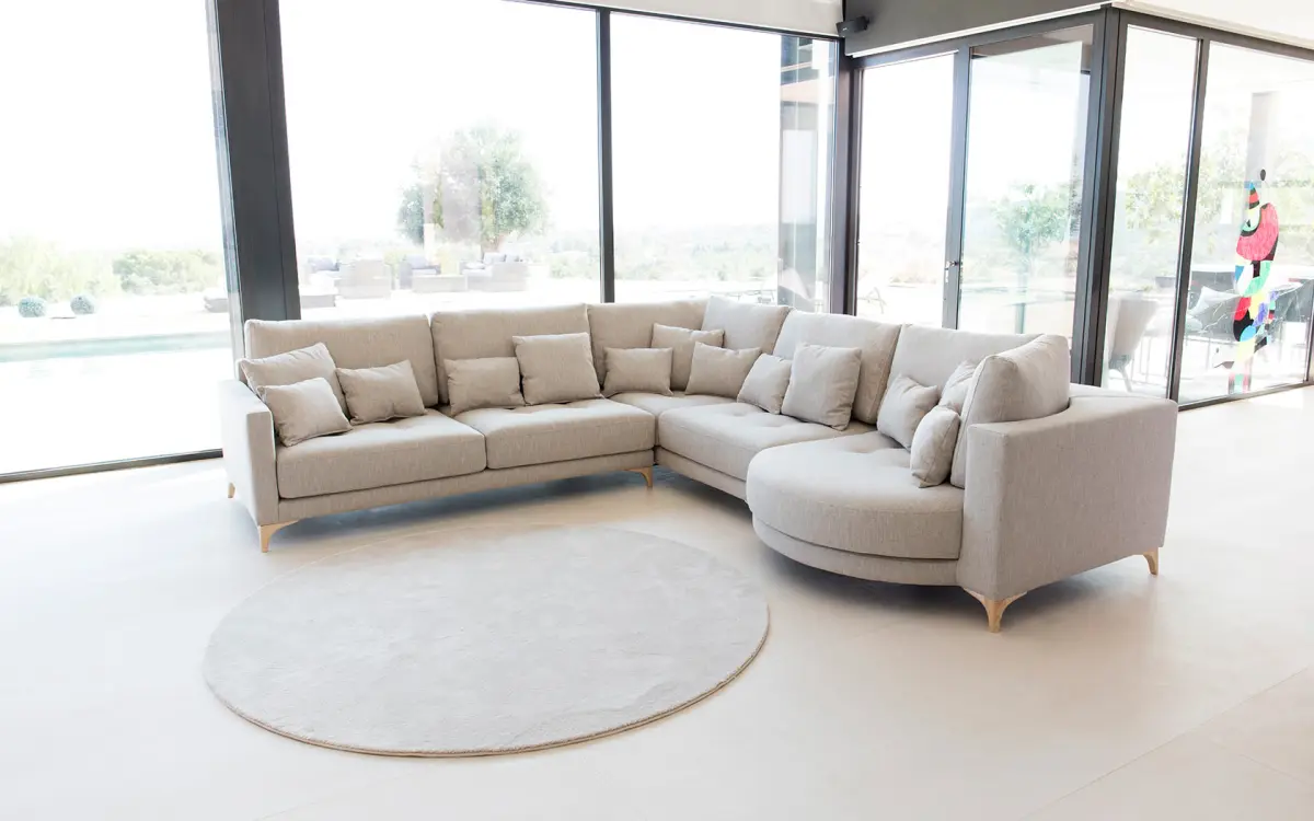 Rinconeras amplias y elegantes, combinando módulos rectos con chaise longue redondo.