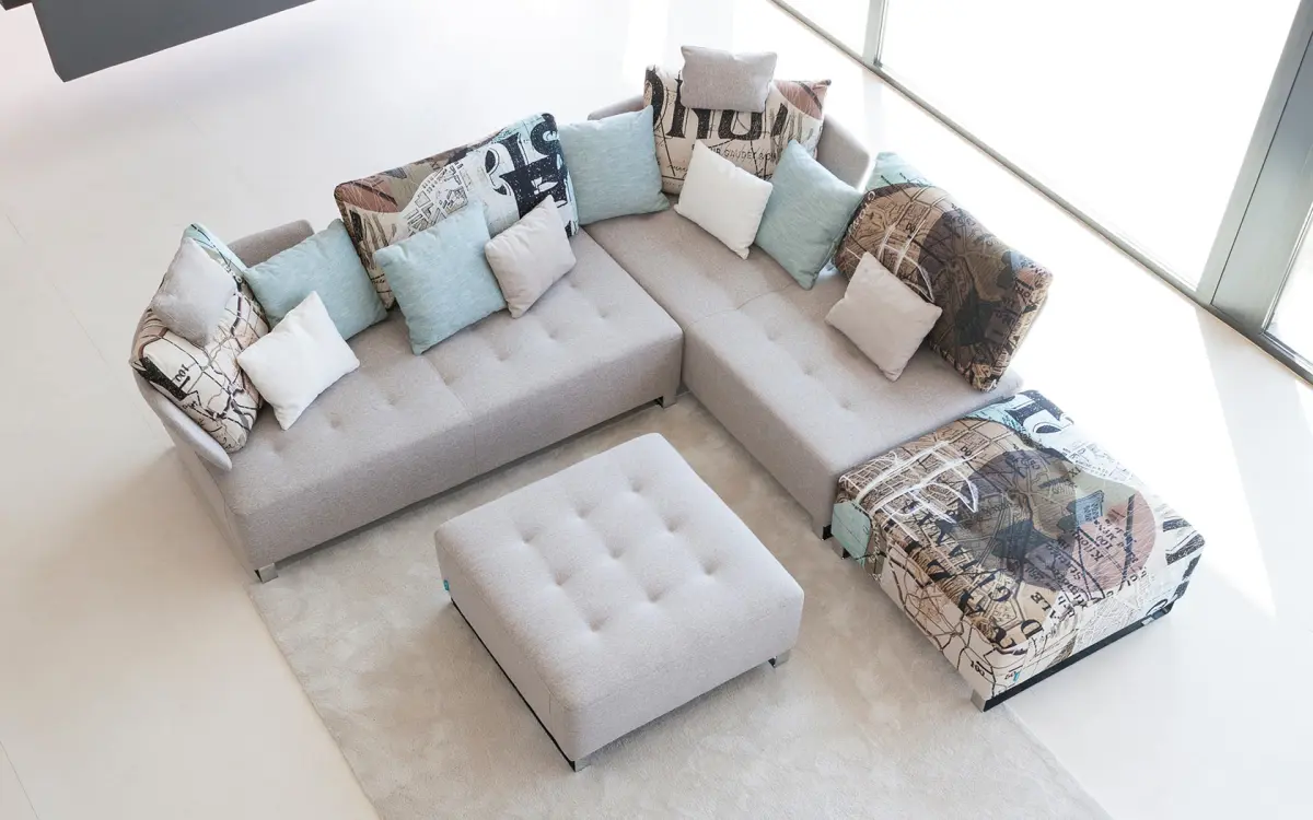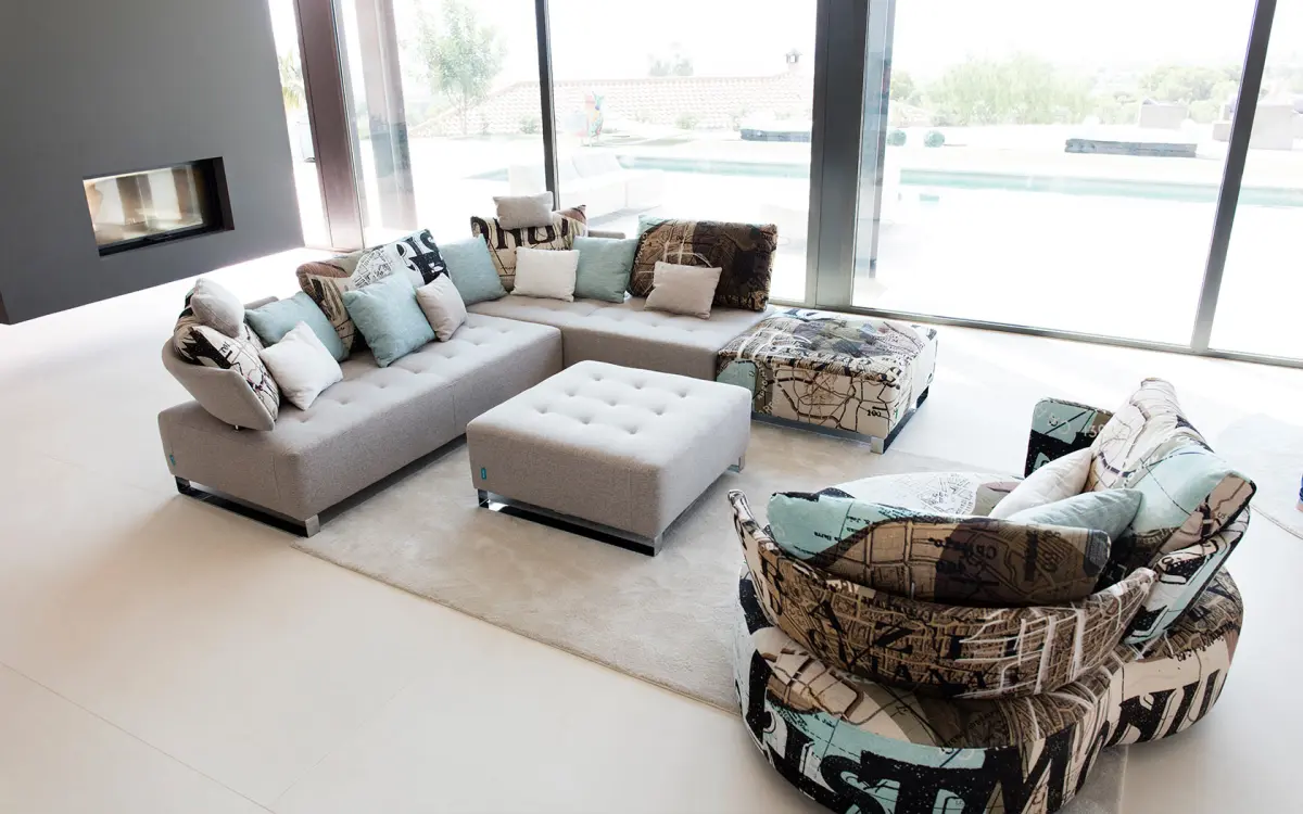 Su diseño modular ofrece libertad total para adaptar la composición al espacio disponible, ya sea en forma lineal o rinconera. Además, la variedad de cojines permite jugar con texturas y tonalidades, aportando dinamismo y estilo al salón.
