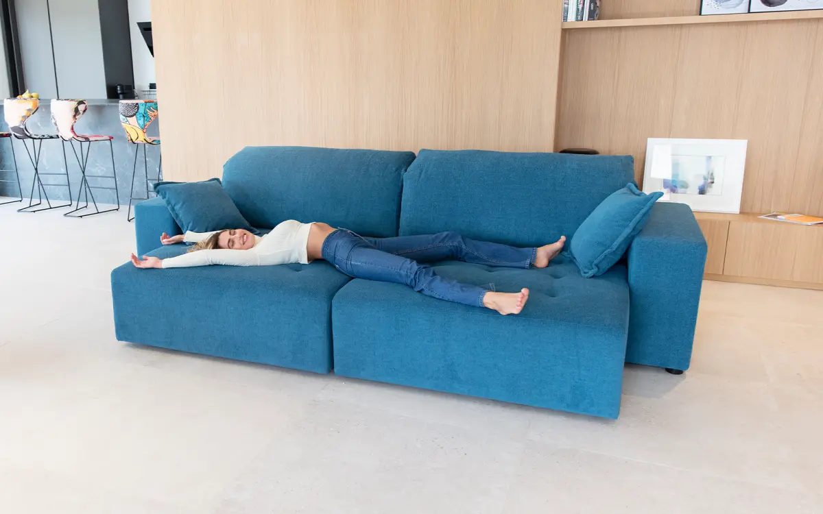 El Paradis no es un sofá extraíble convencional. Su sistema va mucho más allá, ofreciendo una experiencia de descanso única. Con solo pulsar un botón, el asiento aumenta hasta 60 cm de profundidad, convirtiéndose en un enorme chaise longue que se despliega de forma totalmente motorizada y silenciosa.