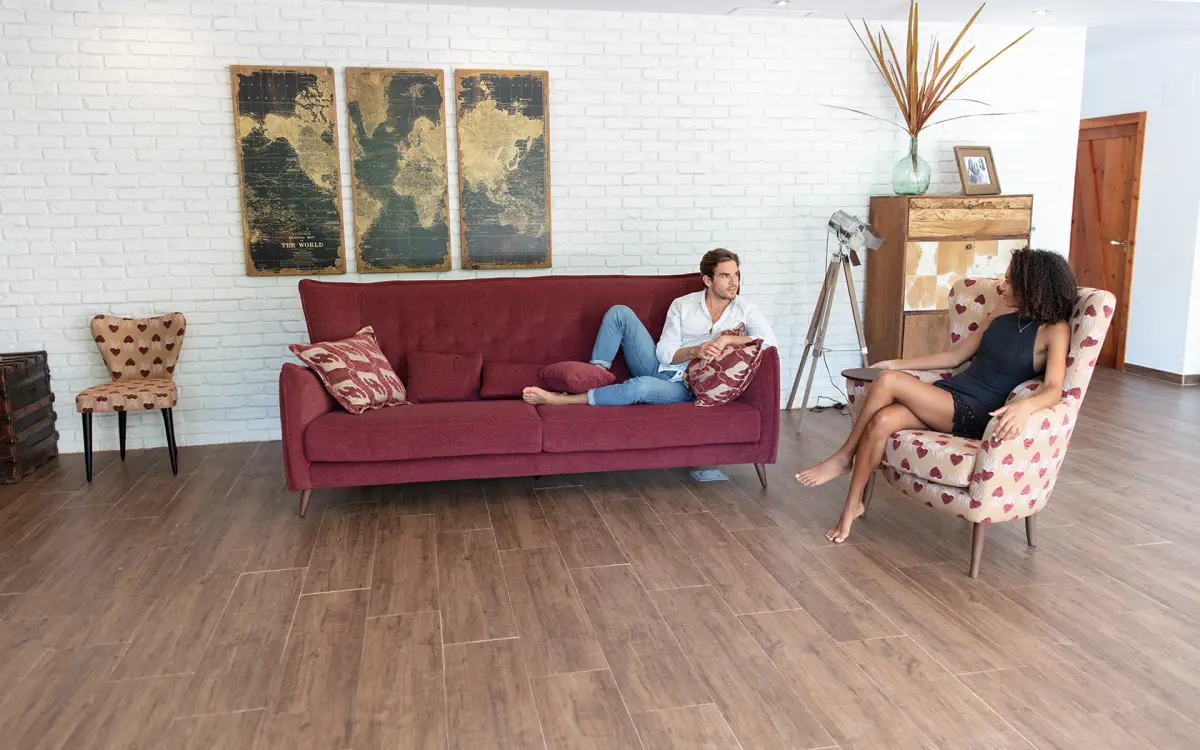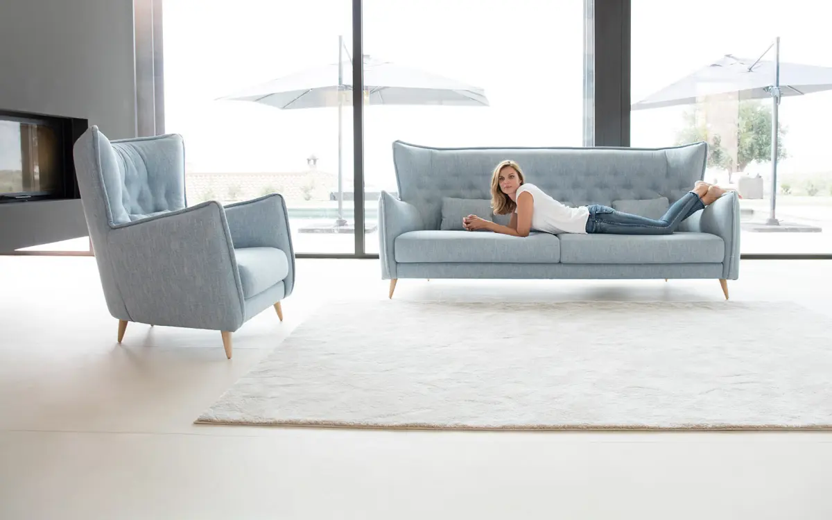 El sofá Simone es una creación de Fama Sofás inspirada en los icónicos diseños de los años 70. Su respaldo con capitoné de rombos rinde homenaje a los clásicos del diseño retro, pero con una reinterpretación contemporánea que lo convierte en una pieza de carácter y elegancia atemporal.