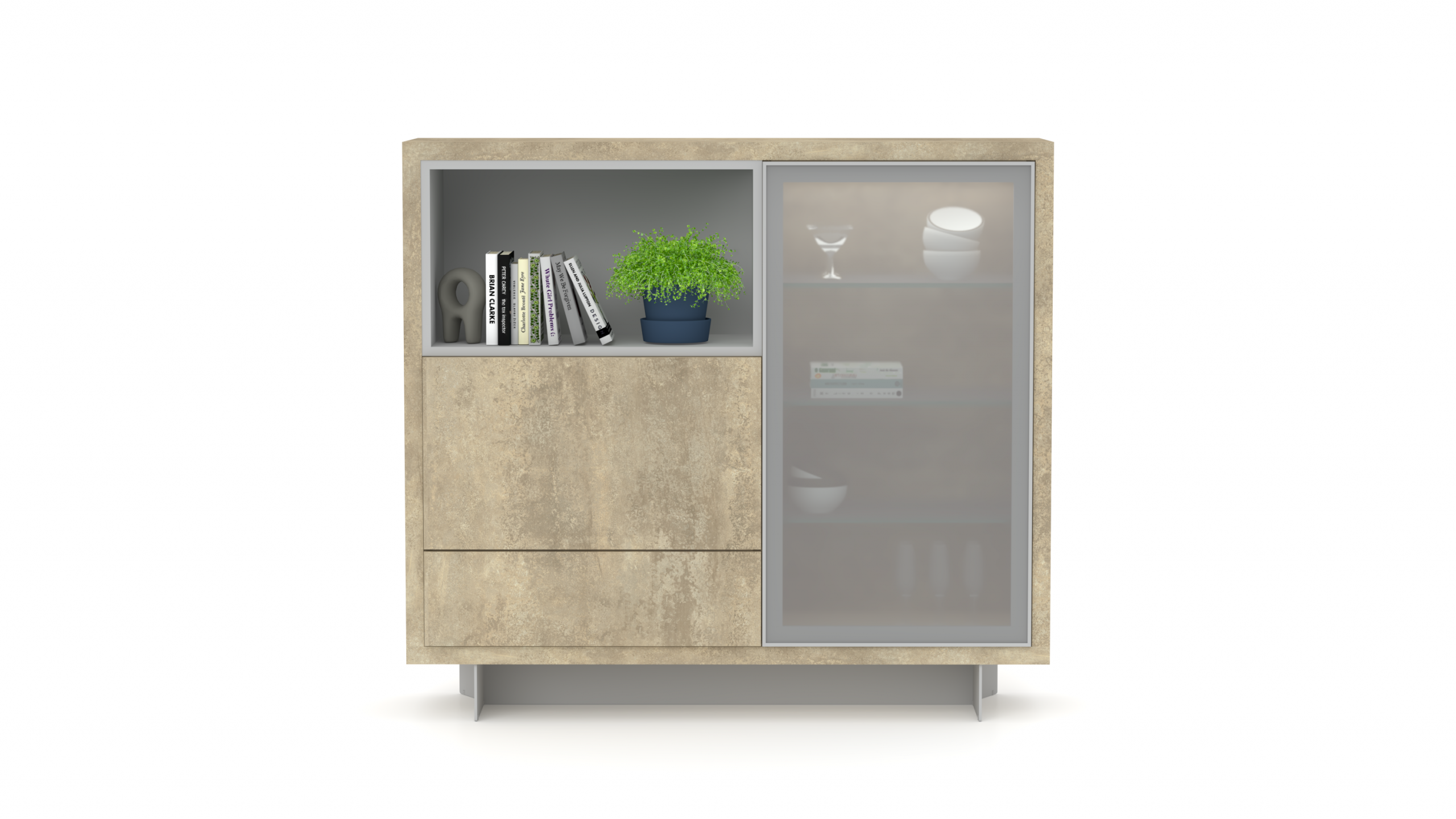 Vitrina con 1 puerta batiente cristal, 1 puerta abatible madera, un hueco y un cajón.