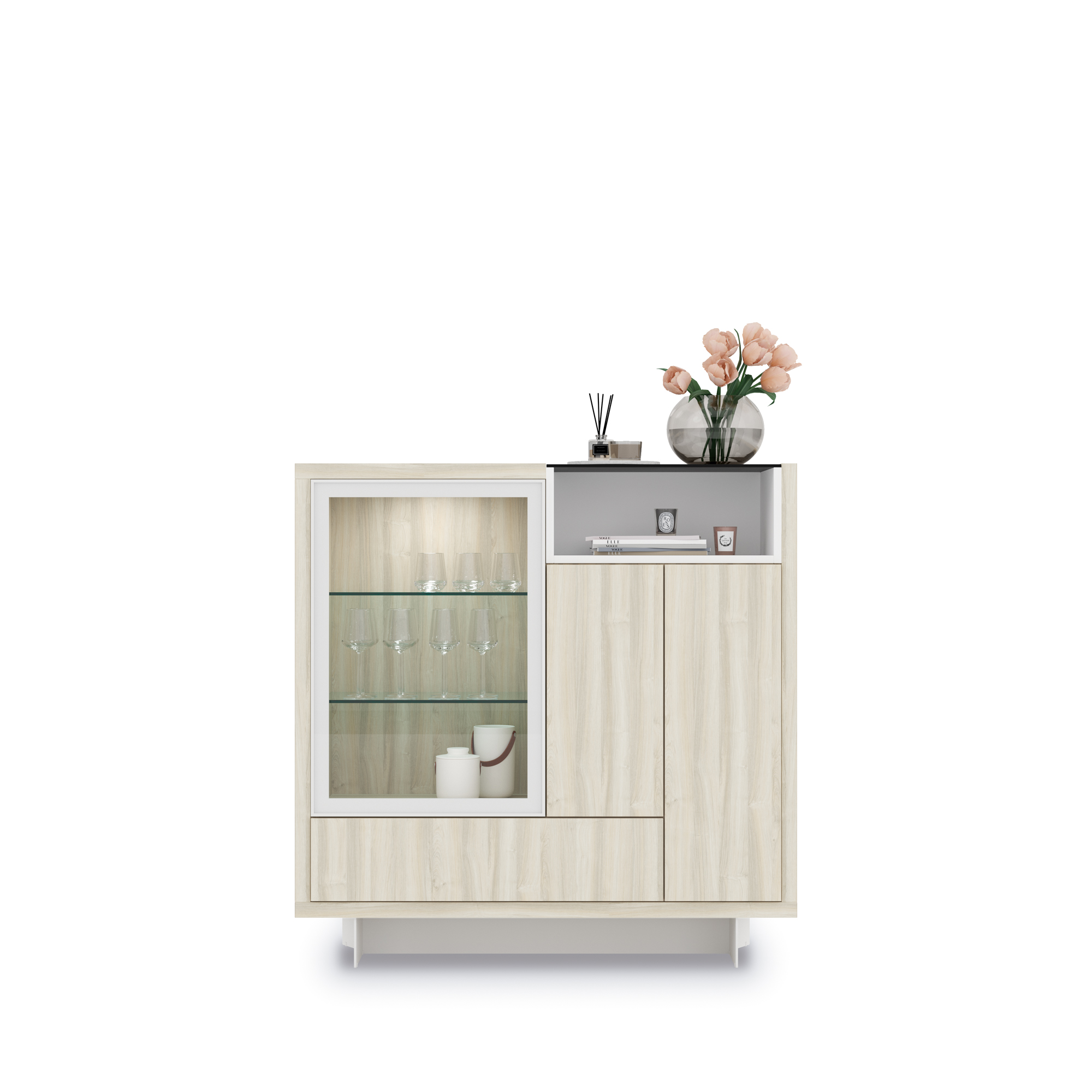 Vitrina 2 puertas batientes, 1 puerta batiente cristal, 1 cajón , hueco y bandeja de cristal.