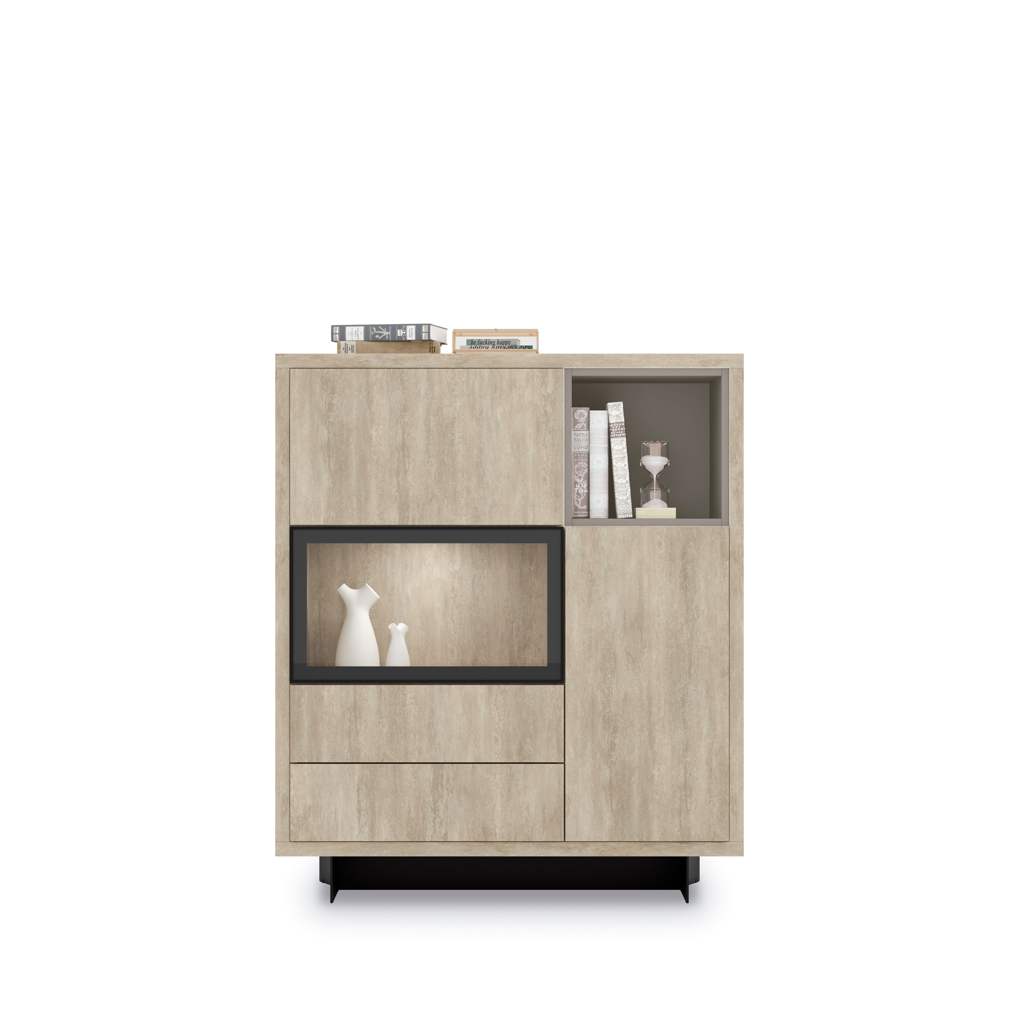 Vitrina 1 puerta batiente, 1 puerta abatible madera , 1 puerta abatible vitrina, 2 cajones y un hueco.
